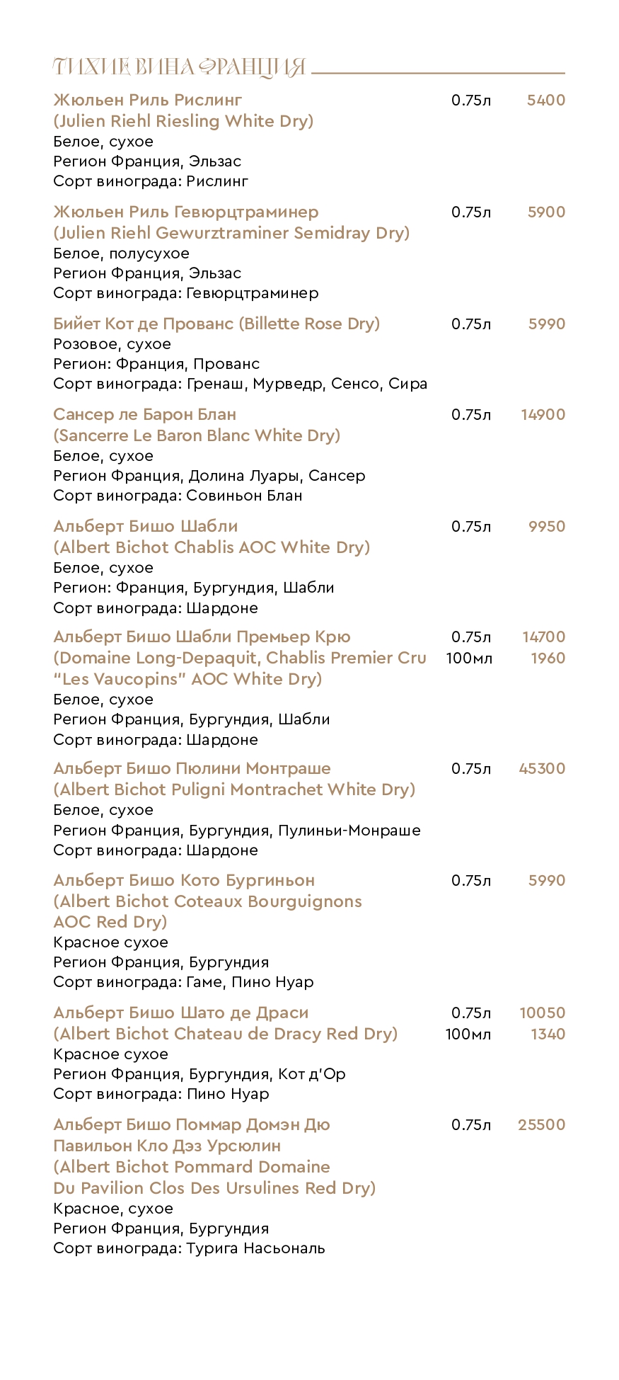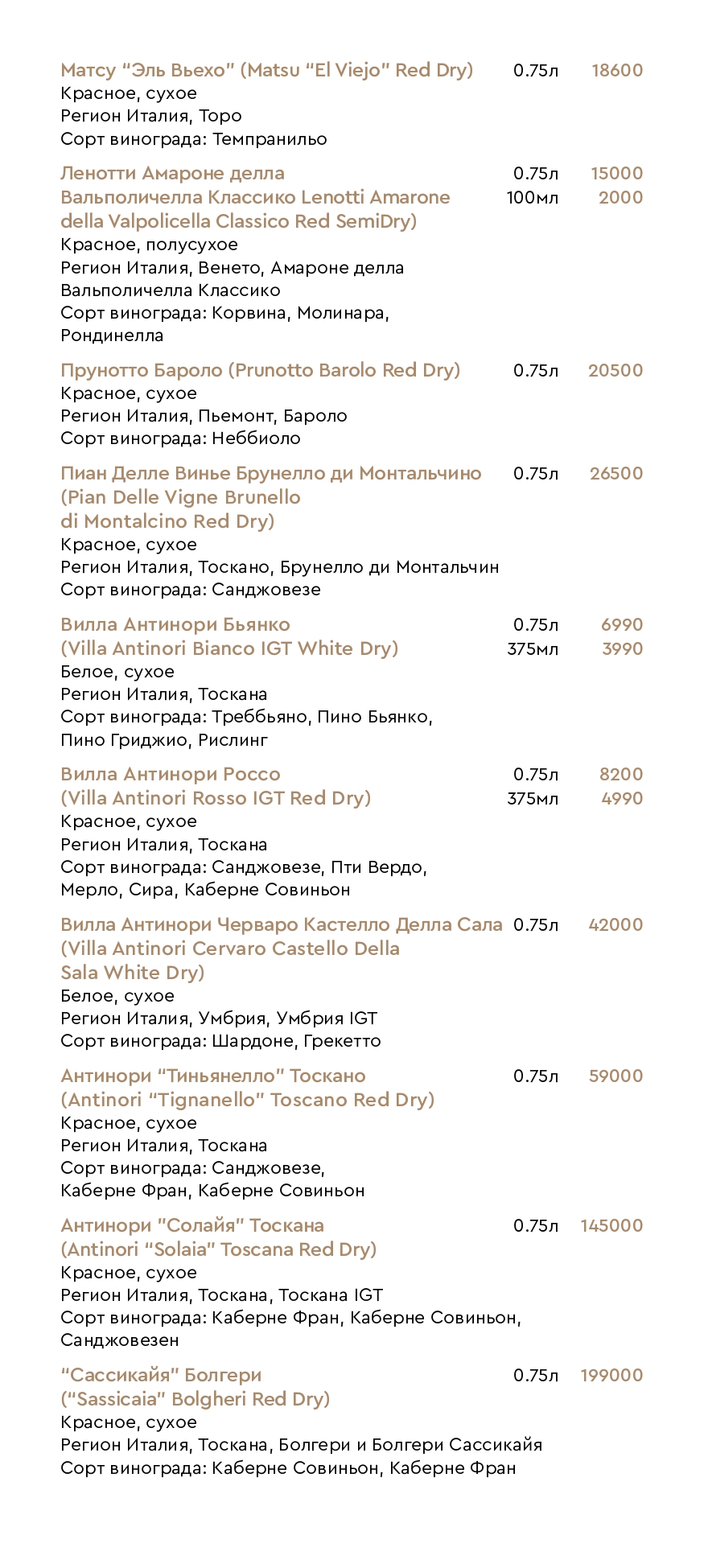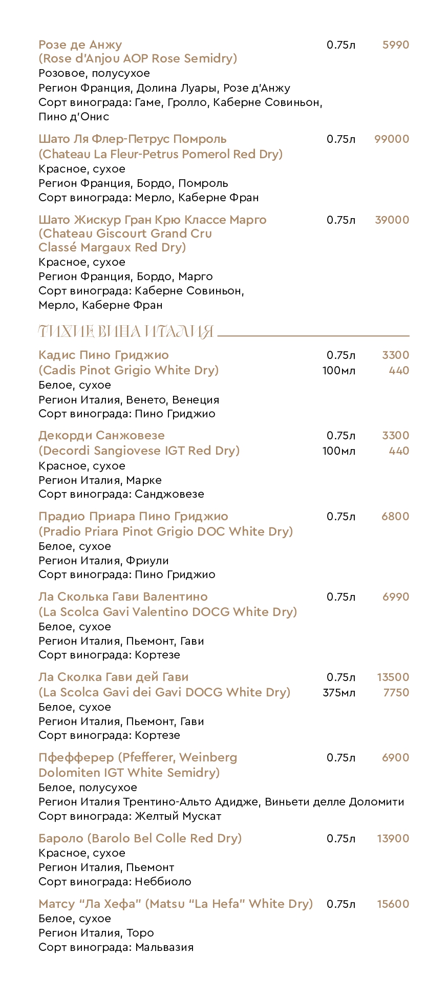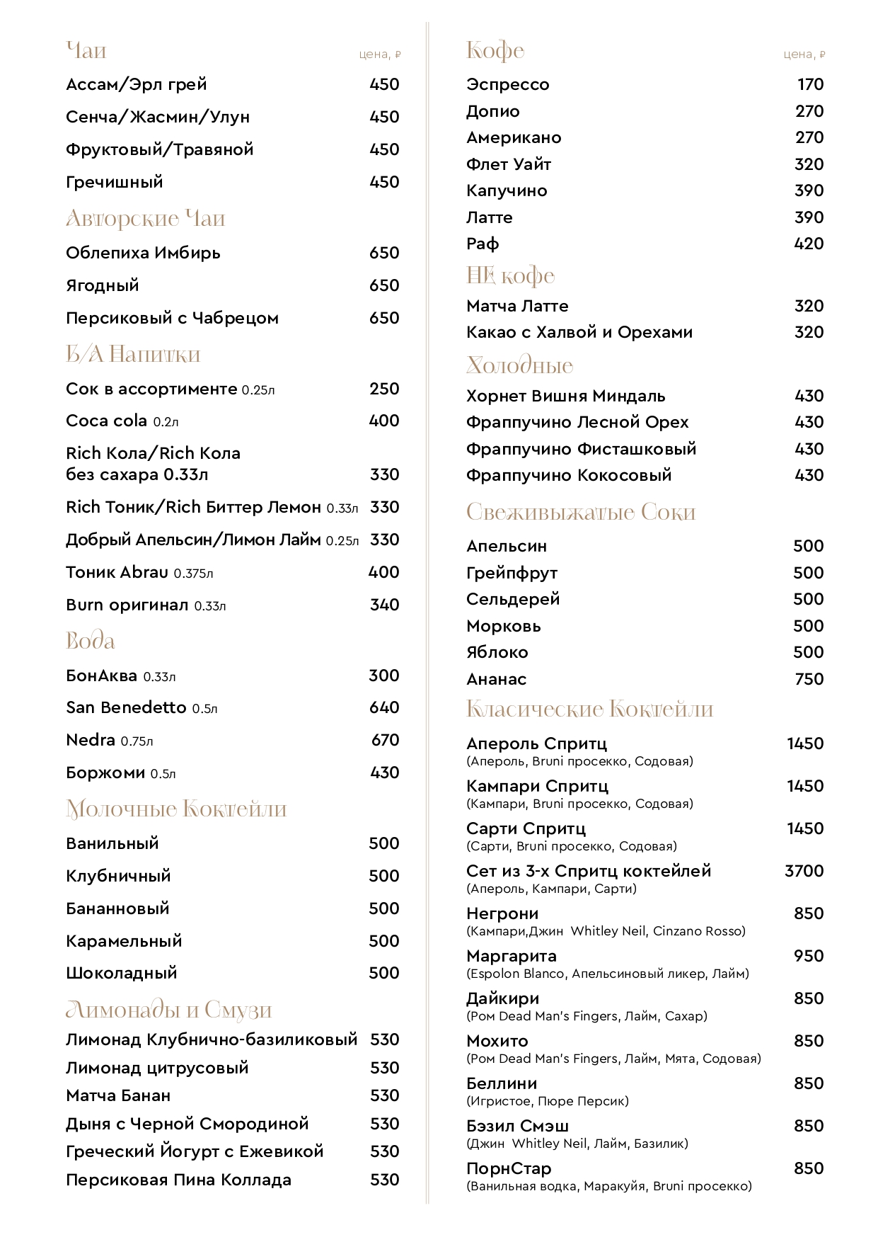 Цены на меню