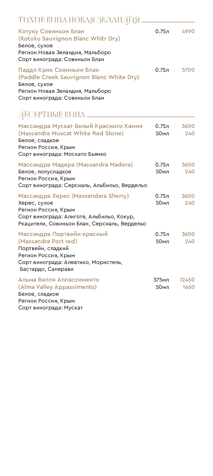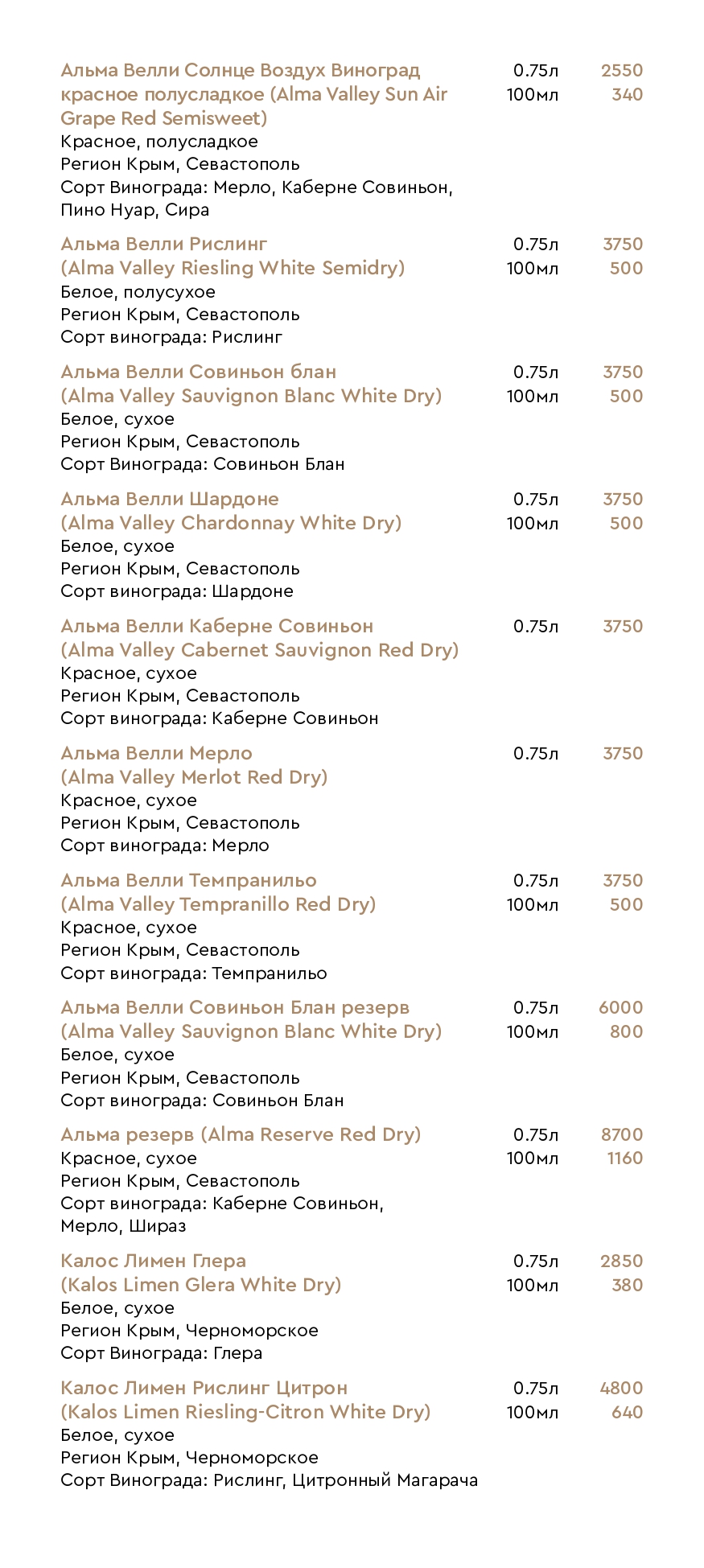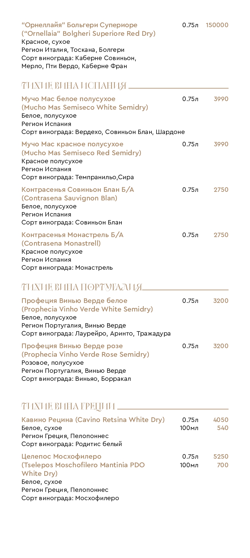 Цены на меню